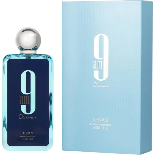 9am Dive  de  Afnan  es una fragancia aromática acuática para hombres. Una fragancia fresca, amaderada y especiada con una concentración de EDP (Eau de Parfum) que evoca una sensación de esperanza y energía juvenil que incita a los demás a ser tan audaces y seguros como la persona que la usa.